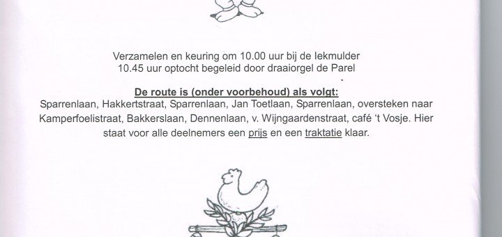 ORANJEVERENIGING IJHORST-LANKHORST Verzamelen en keuring om 10.00 uur bij de Iekmulder 10.45 uur optocht begeleid door draaiorgel de Parel De route is (onder voorbehoud) als volgt: Sparrenlaan, Hakkertstraat, Sparrenlaan, Jan Toetlaan, Sparrenlaan, oversteken naar...