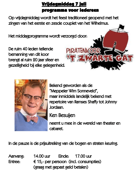 MIDDAG PROGRAMMA VOOR OUD EN JONG Op vrijdagmiddag wordt het feest traditioneel geopend met het zingen van het eerste en het zesde couplet van het Wilhelmus ( afgedrukt op de achterzijde van het programmaboekje)...